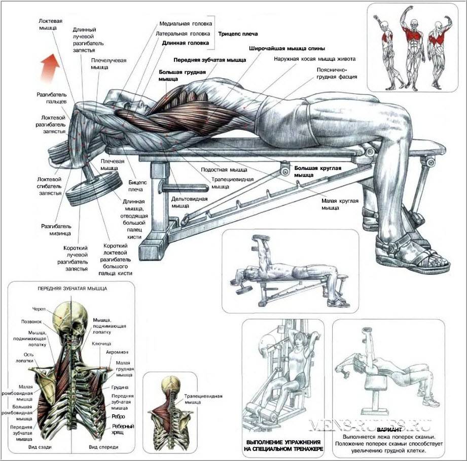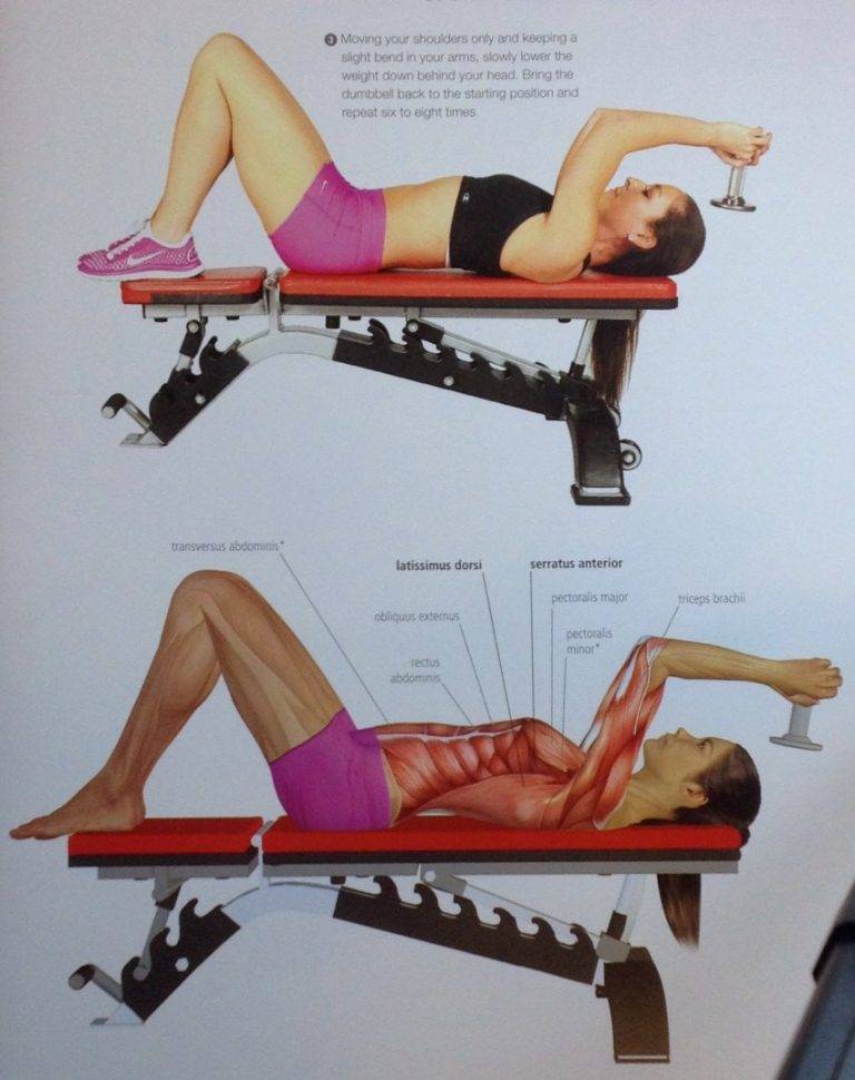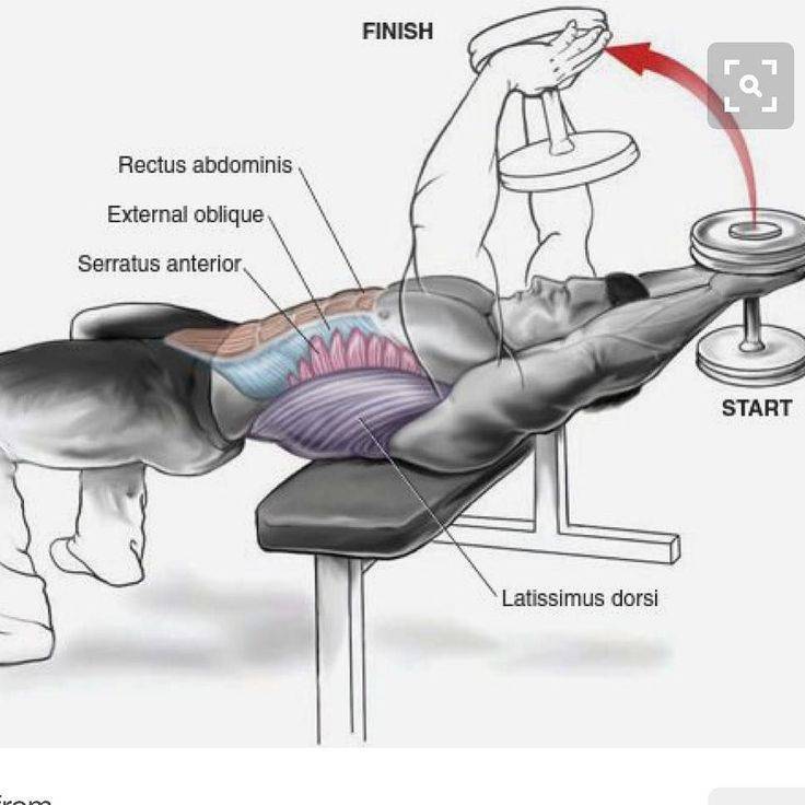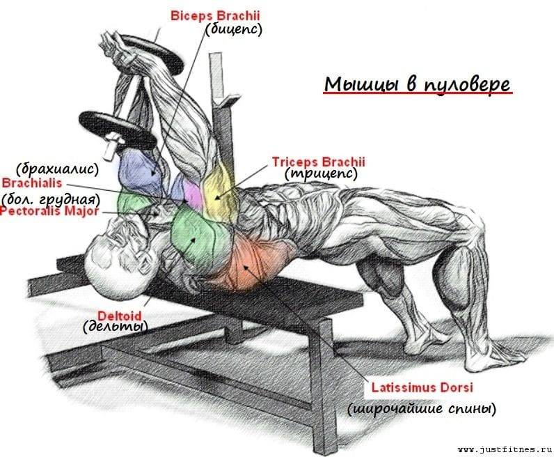 Какие мышцы работают во время выполнения пуловера? Основную работу совершают большая грудная мышца и широчайшие. Кроме того, нагружаются трицепсы, прямая мышцы живота, передняя зубчатая мышца, дельтовидные и малые мышцы спины.