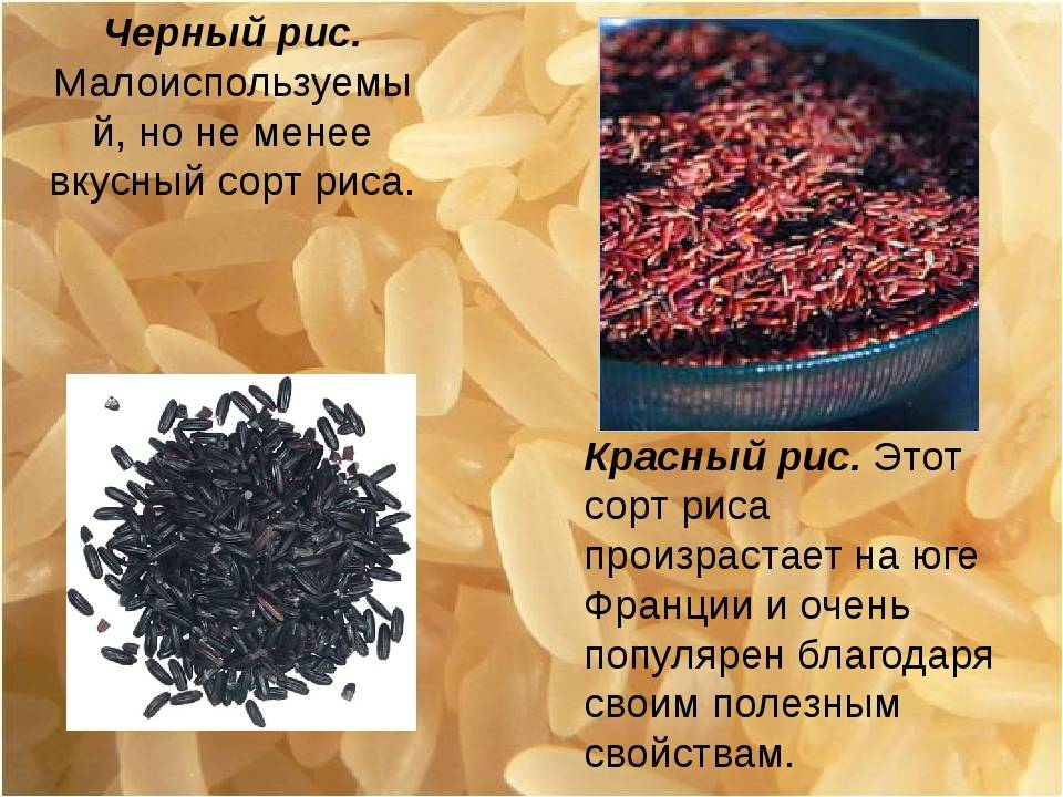 - Дикий рис — так называют цицианию водяную, совершенно другой, хоть и родственный, злак. Это болотная трава, которая стоит дорого ввиду трудоемкости процесса ее выращивания, сбора и обработки. Зерна черного риса жесткие, бывают длинными и круглыми, требуют предварительного замачивания на несколько часов и длительной варки (около 40 минут). Ценность продукт представляет ввиду своей низкой калорийности (всего 100 кКал), высокого содержание белка (15 г), витаминов группы В, фолиевой кислоты (100% дневной нормы), а также магния, фосфора, цинка, марганца. Черным рисом еще называют Чумизу, или головчатое просо.