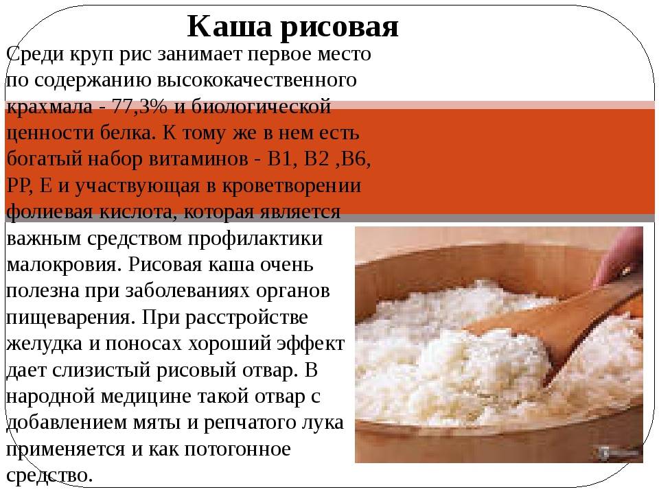 Рис полезен при грудном вскармливании, поскольку является гипоаллергенным продуктом и не вызывает дискомфорта у малыша. Это один из немногих продуктов, который разрешен в первые десять дней кормления после рождения малыша.