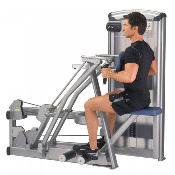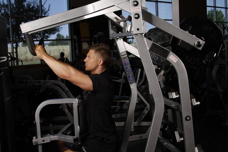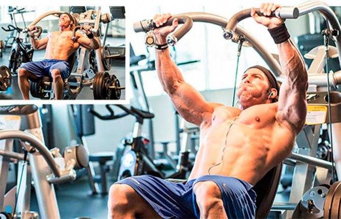 Аналог тяги верхнего блока, но с большей амплитудой. В тренажере рекомендуют заниматься спортсменам, которые не могут выполнить подтягивание. Техника следующая: