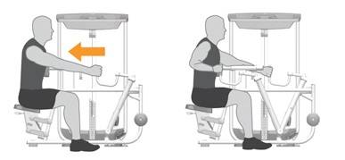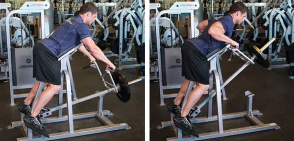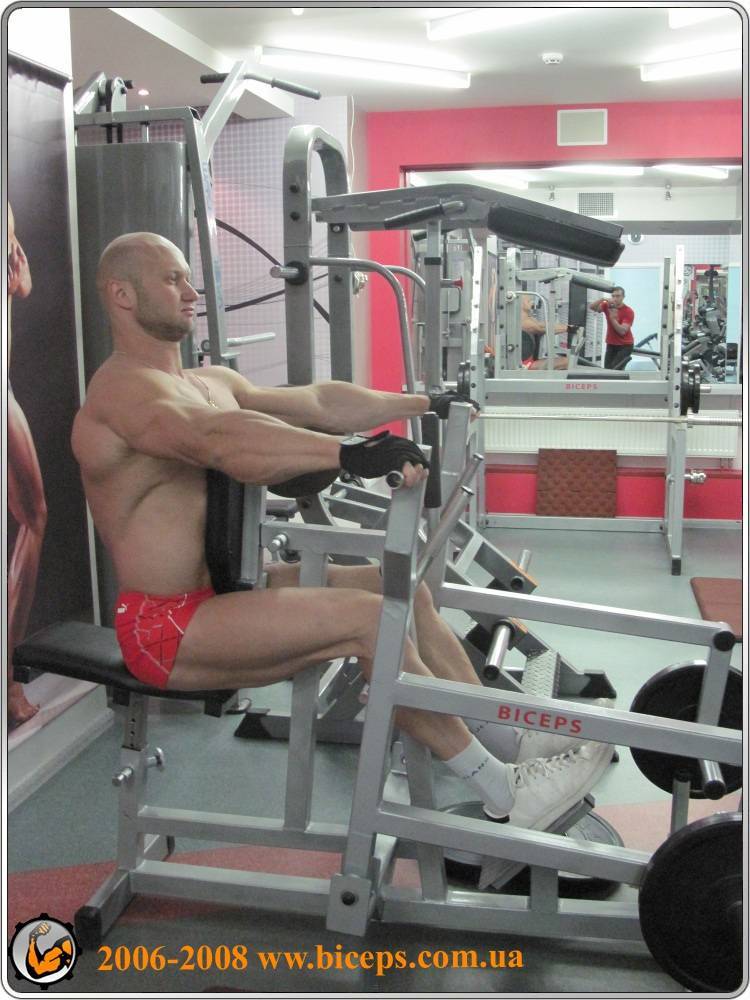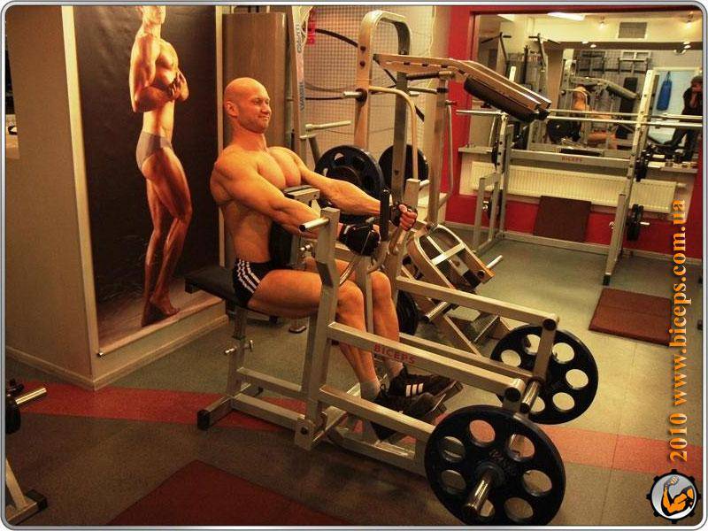 - Спортсмен садится в тренажер и опирается грудью о спинку на уровне солнечного сплетения. В исходном положении лопатки сведены, поясница выпрямлена и слегка прогнута.