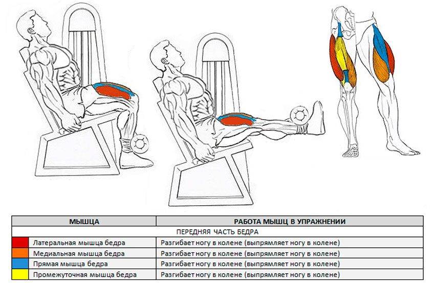 При выполнении разгибаний ног основная нагрузка приходится на четырехглавую мышцу бедра, то есть квадрицепс. Это самая большая мышца в человеческом теле, ее главной функцией является разгибание коленного сустава и выпрямление ноги. Частично данная мышца участвует в сгибании тазобедренного сустава.