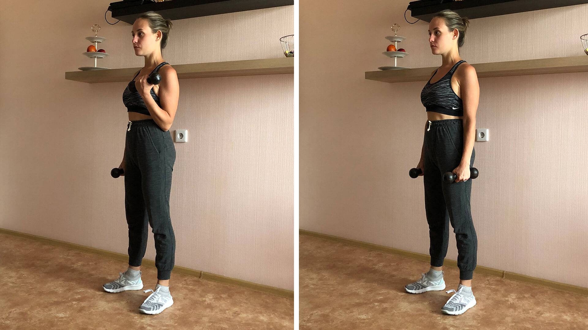 Обязательно разогреваем мышцы до выполнения тренировки. Как минимум выполните амплитудные движения руками, но без гантелей.