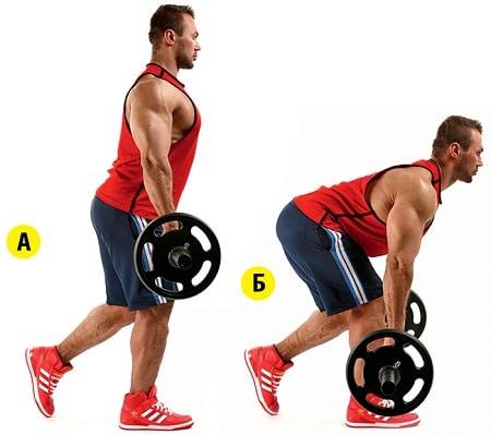 - Начиная тягу следует плавно податься вниз, сгибая колени под углом и одновременно подав таз назад путем отвода назад ягодиц, дабы достигнуть вертикализации позвоночника. Задержавшись в точке пиковой нагрузки необходимо плавно подняться, выпрямляя углы коленей и спины. Девушкам не стоит опускаться слишком низко или дотрагиваться гантелями до рабочей поверхности, а также не рекомендуется подаваться корпусов вперед, что приведет к потере равновесия или скручивания спины.