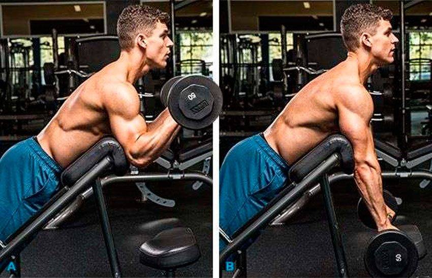 Положение локтей в упражнениях на бицепс смещает нагрузку на разные части головок бицепса – если локти выведены вперед, то нагрузка уходит на переднюю часть головок бицепса, если назад – то на верхнюю часть. Разведение локтей в стороны способствует лучшему пиковому сокращению бицепса