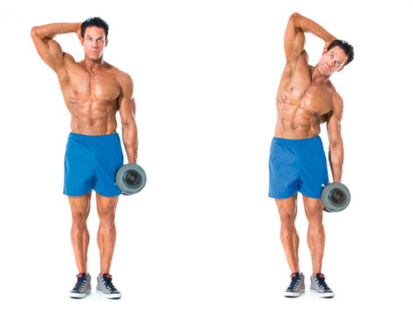 • Один из вариантов упражнения требует одновременного удержания обеих гантелей, другой – позволяет делать упражнение в положении, когда противоположная рука удерживается у виска.