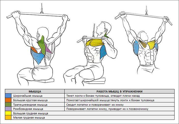 Фишка в том, что в данной форме выполнения упражнения надо стараться взяться за рукоять чуть уже, так широчайшие получат большую нагрузку. Поэкспериментируйте с шириной хвата и выберете наиболее комфортный для вас вариант.