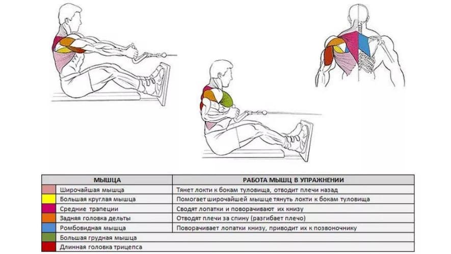 Как вы можете заметить, тяга нижнего блока задействует очень большое количество мышечных групп. Но мы можем менять область воздействия с помощью разнообразных хватов.