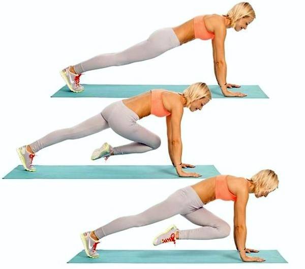 5. Альпинист. Принять положение «планка»: упор лёжа на вытянутых под плечами руках и на носках. Попеременно подтягивать согнутую в колене ногу к груди. По 30 повторений на левую и правую ногу.