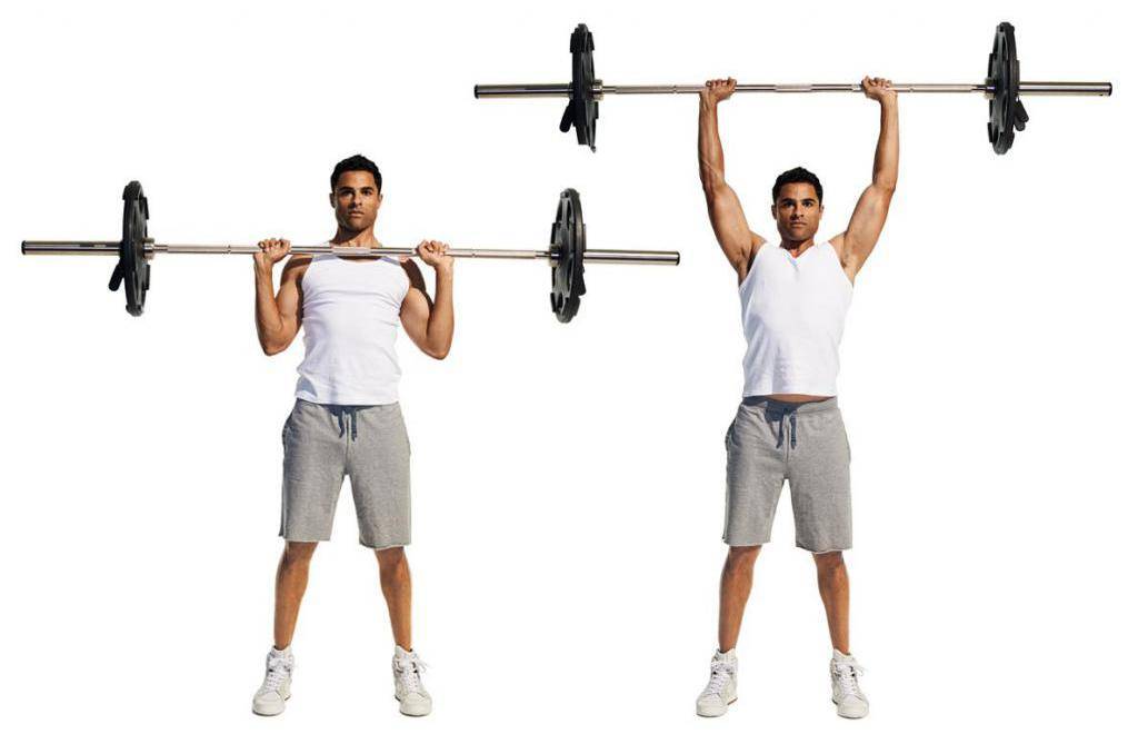 Данное упражнение в простонародье также именуют армейским жимом. При правильном выполнении основную нагрузку будут получать дельты (плечи), верхняя часть груди и трицепсы. Как и в случае с жимом лежа, в жиме штанги стоя при изменении хвата меняется и нагрузка на мышцы: