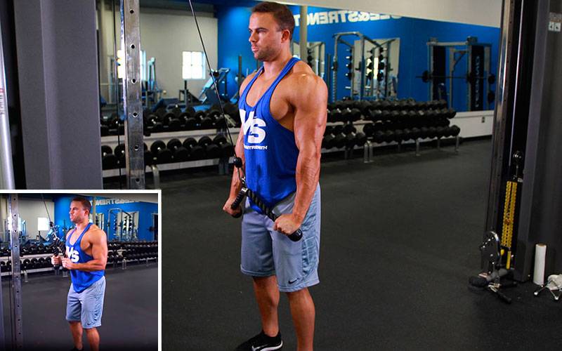 Упражнение выполняют на кроссовере с D-образными рукоятками. Конструкция рукоятки предполагает вертикальное положение ладони, что даёт нагрузку при выполнении тяги на брахиалис. Работа других мышц при таком положении кисти выключается, поэтому нагрузка на брахиалис максимальная.
