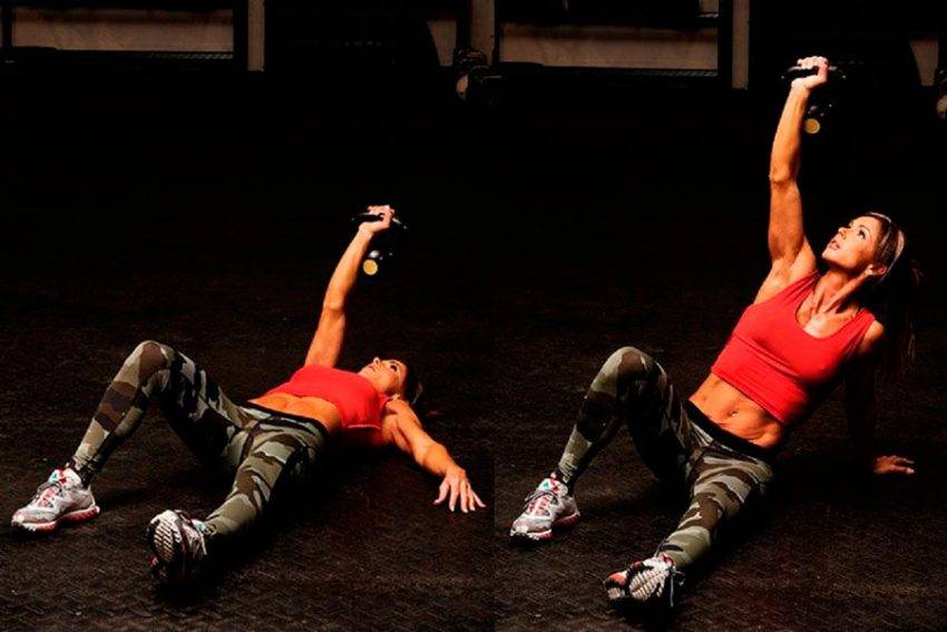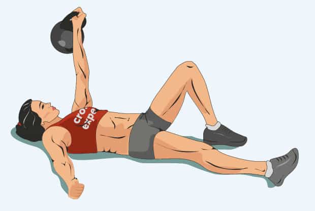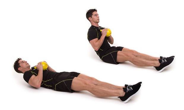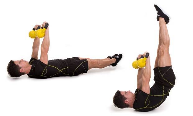 Это классический вариант скручиваний на полу, только с дополнительным отягощением. Снаряд здесь удобнее всего удерживать на груди двумя руками. Не забывайте, что при скручиваниях не нужно отрывать от пола поясницу — только плечевой пояс, при этом скругляясь в позвоночнике и напрягая пресс.