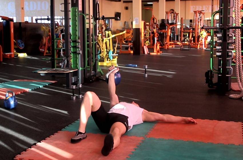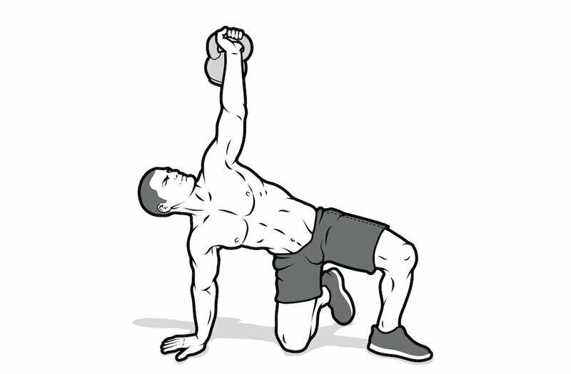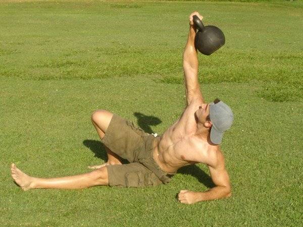 2. Выжмите гирю вверх левой рукой. Правая рука в это время лежит на полу под углом 45 градусов.