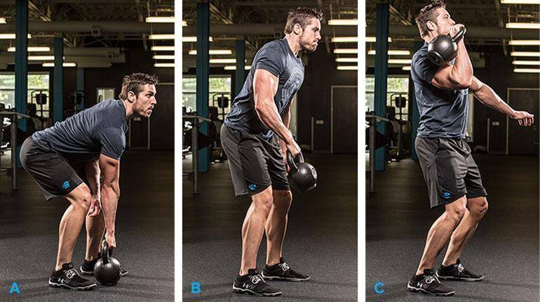 3. На выдохе начинайте мощно вставать, при этом гиря по инерции уже после распрямления ног будет продолжать идти вверх. Усилием дельт и трапеций продолжите ее движение до верхней части груди. Локти при этом должны уходить вверх, выше уровня кистей.