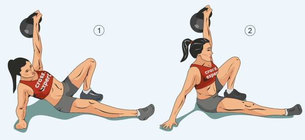 3. Согните ногу в левом колене. Взгляд устремлён на гирю. Приподнимитесь на локте (не отрывая взгляд от гири), затем полностью выпрямите руку.