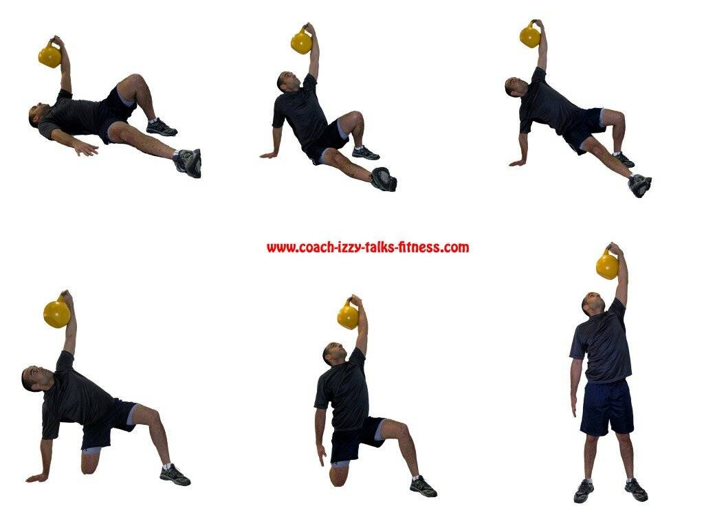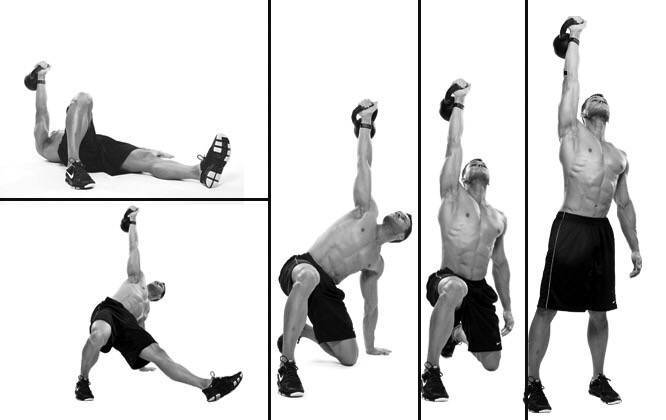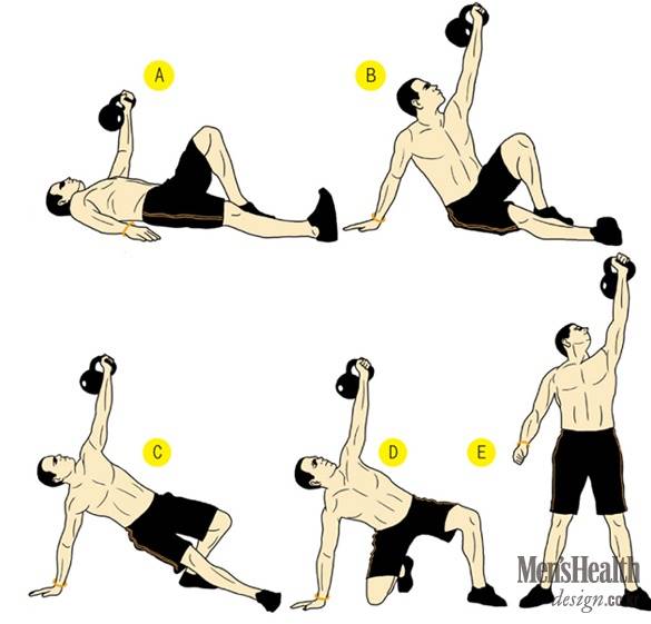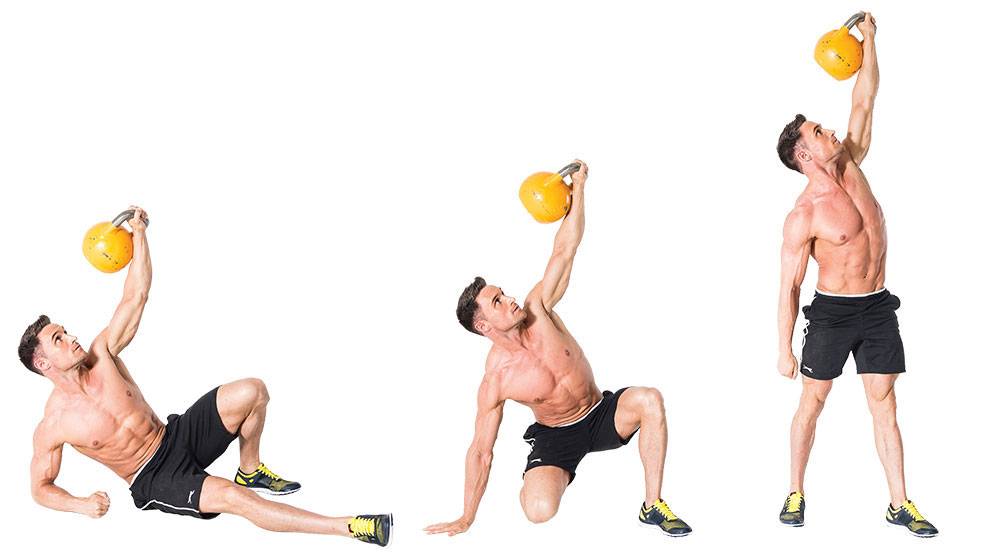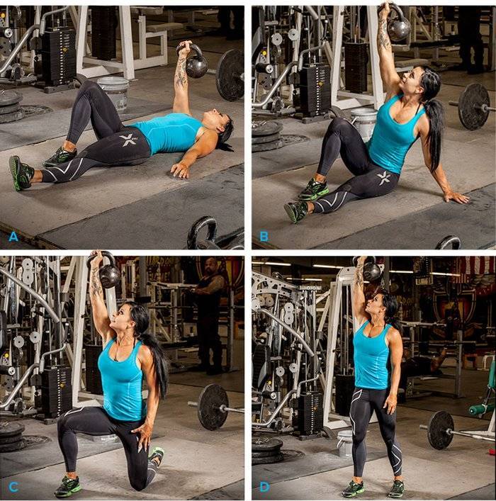 Обратите внимание на важный нюанс, обеспечивающий чистоту выполнения турецкого подъема: когда встаете, тело должно быть полностью выпрямлено, а в конце и в начале выполнения упражнения снаряд должен касаться земли