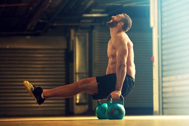 2. Сядьте между снарядов, вытяните вперед ноги, обхватите ручки гирь, выпрямите руки. Таз при этом должен оторваться от пола.