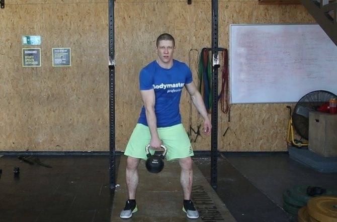 Поставьте ноги чуть шире плеч, гири расположены между ними. Спину держим прямо, взгляд направлен перед собой.