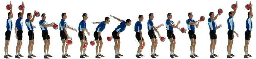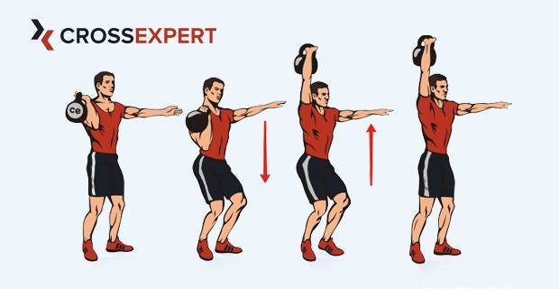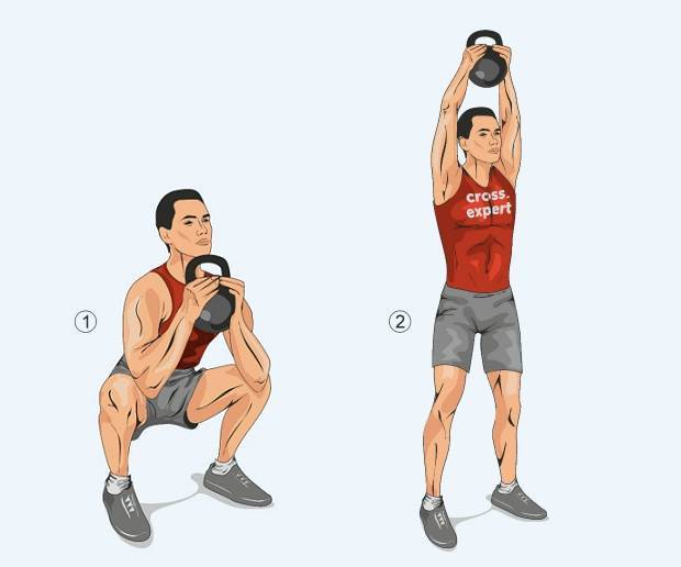 Выбросы с гирей представляют собой гоблет-приседание с выжиманием снаряда над головой одновременно с подъемом.