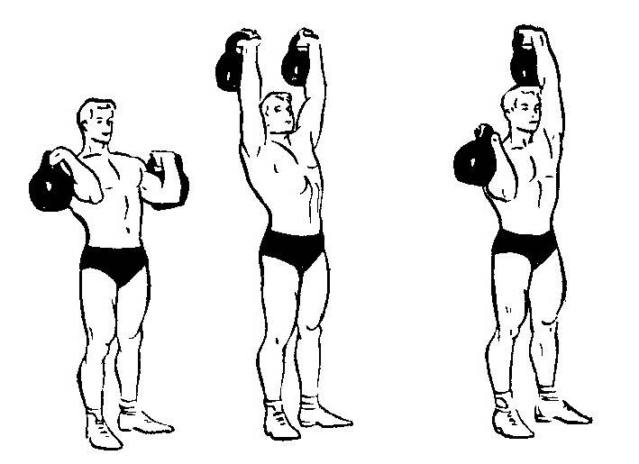 Это упражнение также пришло из гиревого спорта. Здесь активно работают плечи, трапеции, разгибатели позвоночника, также включаются ноги, но меньше, чем при выполнении, например, рывка гири в сед.