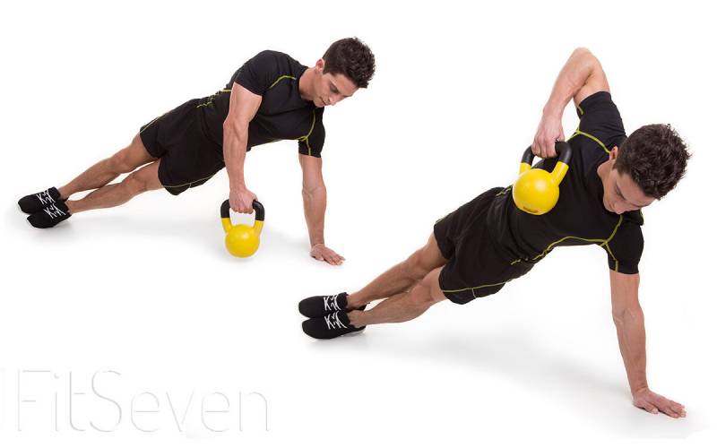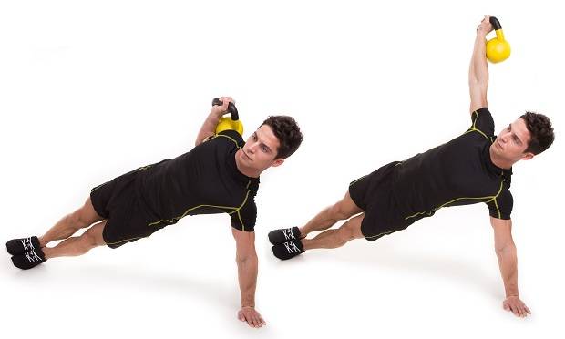 Здесь в статике работают уже косые мышцы живота. Гирю можно удерживать свободной рукой у плеча либо на вытянутой вверх руке. Стоять в планке можно как на локте, так и на выпрямленной руке.
