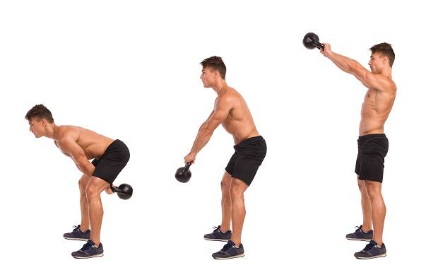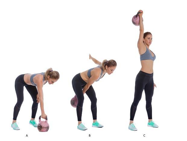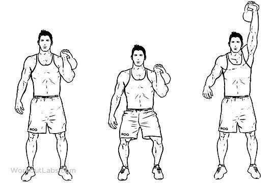 3. Возьмите гирю, сделайте небольшой замах назад и тут же начинайте ее подъем вверх, помогая корпусом и тазом. Рука не должна сгибаться и разгибаться — все движение идет за счет инерции и усилий дельтовидных и трапеции.