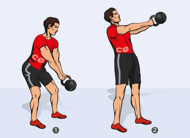 Выполните замах гирь между ног, в пояснице остается естественный прогиб. Выполнить наклон вперёд. Чем сильнее мы делаем замах, тем большую амплитуду проходят гири за счет силы инерции.