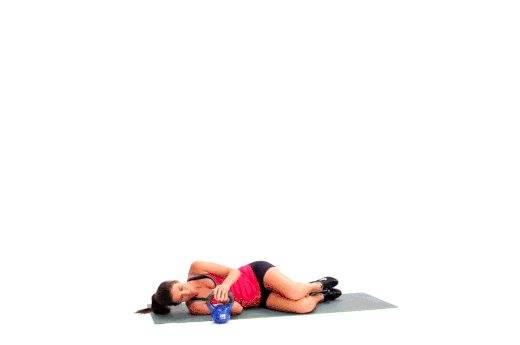 1. Займите положение лёжа на спине. Гиря стоит на полу рядом с плечом. Повернитесь на левый бок и возьмите гирю двумя руками (сверху и снизу дужки), перевернитесь обратно на спину.