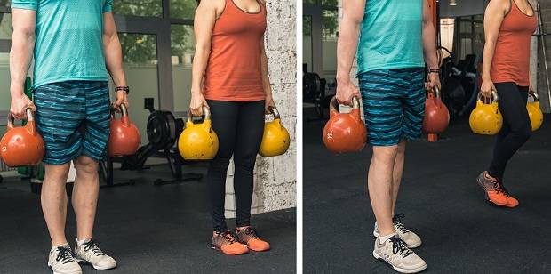 Данное упражнение развивает все мышцы ног, укрепляет хват, здесь хорошо работают мышцы пресса и предплечья. Техника проста — берите в руки две тяжелые гири и не спеша идите вперед короткими шагами. При этом не скругляйте плечи, держите спину прямой, сведите лопатки.