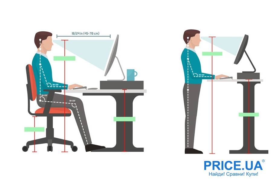 • расположение прибора относительно смотрящего. Око устроено так, что комфортным полем зрения считается видение объектов впереди, с незначительным уклоном вниз. Если верхний край монитора находится выше уровня глаз, то изображение «выпадает» из естественного диапазона и вынуждает активно задействовать мышцы ока;