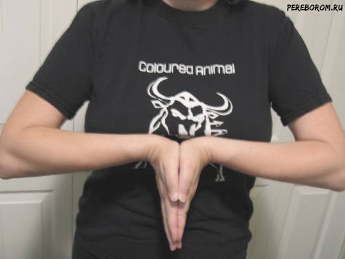 Указательный палец левой руки соединяется с большим пальцем правой руки. Затем указательный палец правой руки соединяется с большим пальцем левой руки. Так же соединяем средний палец левой руки с большим пальцем правой руки, меняем руки; соединяем безымянный палец левой руки с большим пальцем правой руки; меняем руки; мизинец одной руки – с большим пальцем другой руки.
