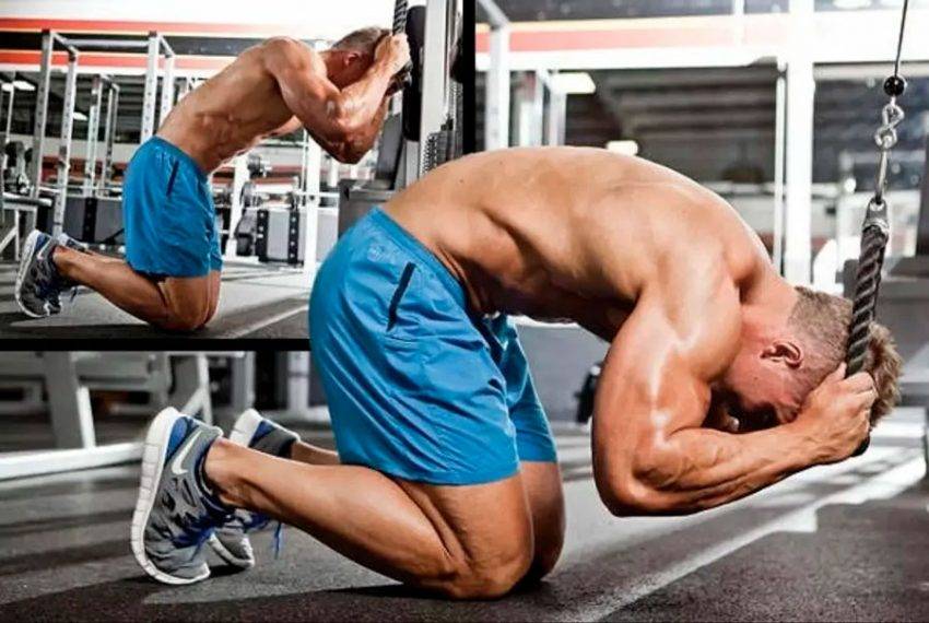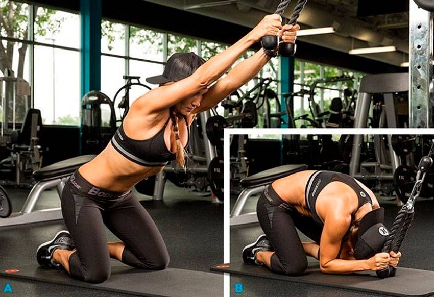 - В положении стоя на коленях крепление блока опускают чуть ниже, и встают обычно лицом к тренажеру;