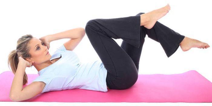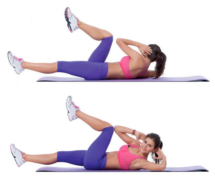 - 3. Следует двигать ногами, как бы прокручивая педали, выпрямляя одну ногу и подтягивая к груди другую. При сгибании правой ноги, отрывать от пола левую лопатку и вести навстречу колену локоть, затем то же самое сделать с левой ногой и правым локтем. Стараться держать локти в прежнем положении, не сдвигая их относительно друг друга в попытке приблизить к колену, чтобы в этом были задействованы прежде всего мышцы живота.