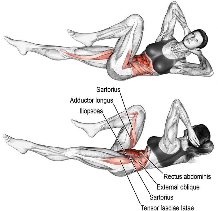 По сути упражнение представляет собой усложненную вариацию классических кранчей, которая предполагает не только изолированное скручивание верхней части корпуса, но и одновременное участие ног.