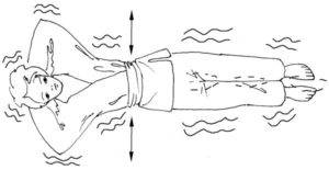 - На счет «семь» делаем то же самое с левой ноги.Теперь заводим руки под шею и начинаем вибрировать всем телом то вправо, то влево, как будто имитируем движения рыбки.Чтобы удобнее было выполнять вибрацию, можно слегка оторвать от пола голову и пятки.Ослабленным людям рекомендуется делать всего несколько вибраций, постепенно доводя продолжительность сеанса до трех минут.