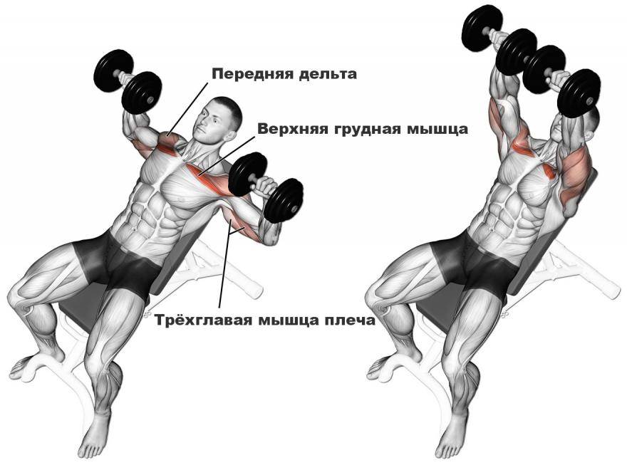 - На выдохе нужно сознательно напрячь грудные, и толкнуть гантели вверх;
