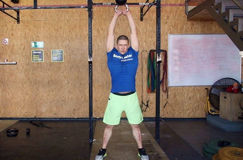 Поскольку жим гири – это не изолированная работа рук, здесь подключаются мышцы спины, живота, поэтому важно избегать травм полным разогревом.